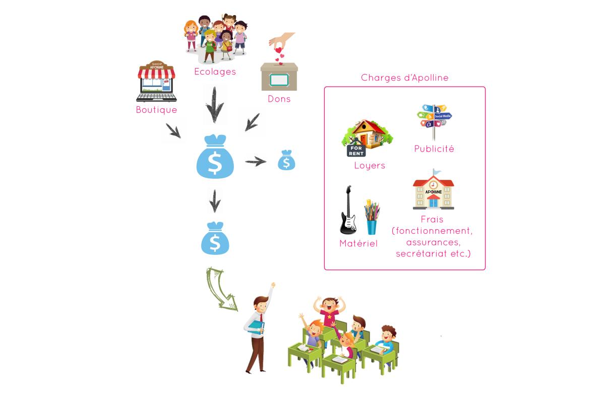 En réalité, l’école fonctionne comme une association de professeurs. Toutes les personnes impliquées dans l’école sont des enseignants, tous étant rémunérés selon le même système, illustré sur le schéma ci-dessus.